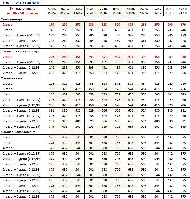 За места в хотела и калкулация на цена ни трябват точни дати от/до, брой нощувки, колко възрастни и деца в стая, навършени години на децата. Ползвайте бутона - Резервирай за да видите всички цени Или се обадете на 02 / 950 22 05, 02 / 980 1004, 0885 596 067