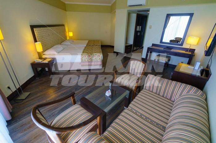 Стаите в хотела са елегантно декорирани и обзаведени. Всяка от тях разполага с балкон с живописна гледка и LCD телевизор с канали, както и с климатик и минибар. В хотела се организират и всекидневни анимационни и вечерни програми, което е гаранция за доброто настроение на гостите. Налични са и тенис корт и водни спортове.Обслужващи части и други условия