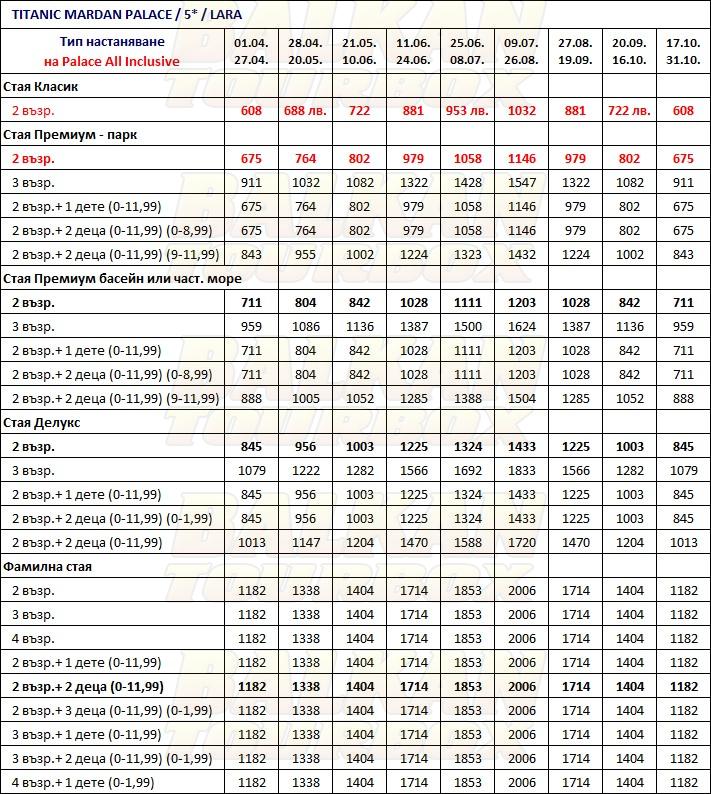 Titanic Mardan Palace е разположен в курорта Лара, на около 10 км от летището в Анталия,на 15 км от центъра на Анталия. Той притежава интересна архитектура, изключителен и модерен интериор, а на гостите си предлага един основен и 10 ресторанта а ла карт, руски,френски, турски, вегетариански, рибен, средиземноморски, тайландски, японски, бразилски и 9 разнообразни барове, няма да изреждаме всички спа и фитнес глезотии. Очаквма ви квалифициран персонал и интересни преживявания.Обслужващи части и други условия