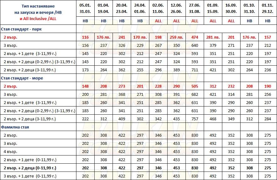 За места в хотела и калкулация на цена ни трябват точни дати от/до, брой нощувки, колко възрастни и деца в стая, навършени години на децата. Ползвайте бутона - Резервирай за да видите всички цени Или се обадете на 02 / 950 22 05, 02 / 980 1004, 0885 596 067