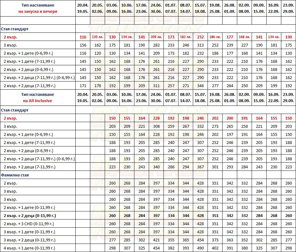 За места в хотела и калкулация на цена ни трябват точни дати от/до, брой нощувки, колко възрастни и деца в стая, навършени години на децата. Ползвайте бутона - Резервирай за да видите всички цени Или се обадете на 02 / 950 22 05, 02 / 980 1004, 0885 596 067
