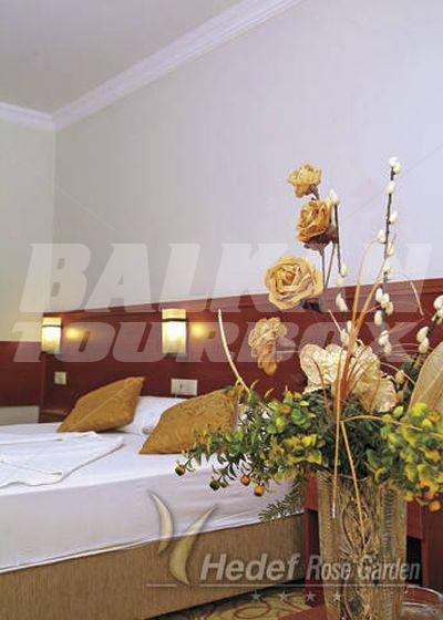 Хотел Hedef Rose Garden е разположен на 100 км от летището на Анталия, на 12 км от курорта Алания. Хотелът се състои от два съединени помежду си 5-етажни корпуса. Построен е през 2007 г. на обща площ от 12 000 квадратни метра площ.Hedef Rose Garden прдлага на своите гости за настаняване 240 елегантно обзаведени стаи и апартаменти. Те са снабдени с климатик, собствен санитарен възел, сешоар, телевизор, мини бар(празен), сейф, телефон, балкон ( 100 от стаите са с изглед към морето, 80 с изглед към басейна и 60 към зеления парк).Почистването е ежедневно, смяна на белюото – два пъти в седмицата.