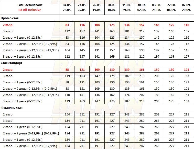 За места в хотела и калкулация на цена ни трябват точни дати от/до, брой нощувки, колко възрастни и деца в стая, навършени години на децата. Ползвайте бутона - Резервирай за да видите всички цени Или се обадете на 02 / 950 22 05, 02 / 980 1004, 0885 596 067