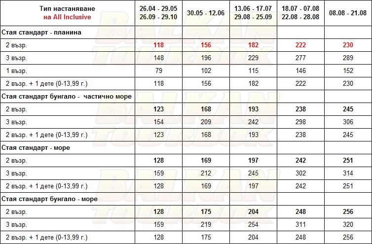 За места в хотела и калкулация на цена ни трябват точни дати от/до, брой нощувки, колко възрастни и деца в стая, навършени години на децата. Ползвайте бутона - Резервирай за да видите всички цени Или се обадете на 02 / 950 22 05, 02 / 980 1004, 0885 596 067