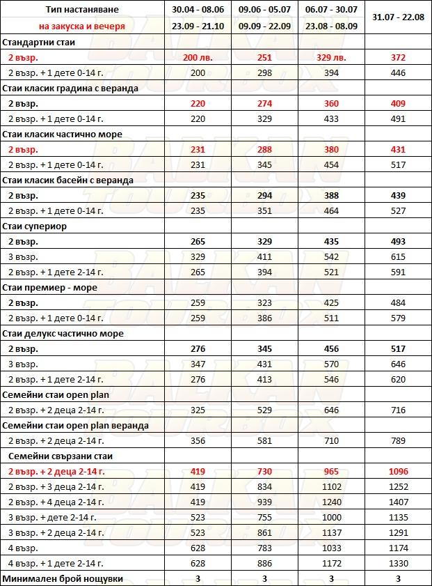 За места в хотела и калкулация на цена ни трябват точни дати от/до, брой нощувки, колко възрастни и деца в стая, навършени години на децата. Ползвайте бутона - Резервирай за да видите всички цени Или се обадете на 02 / 950 22 05, 02 / 980 1004, 0885 596 067
