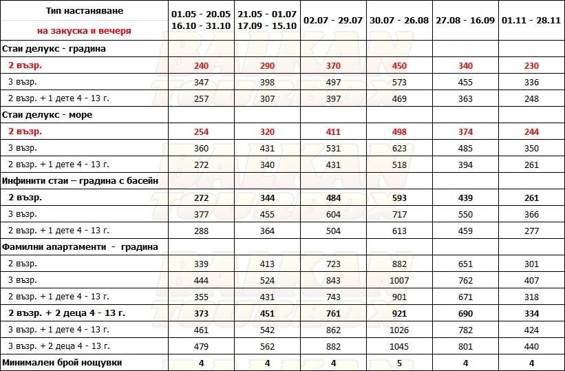 За места в хотела и калкулация на цена ни трябват точни дати от/до, брой нощувки, колко възрастни и деца в стая, навършени години на децата. Ползвайте бутона - Резервирай за да видите всички цени Или се обадете на 02 / 950 22 05, 02 / 980 1004, 0885 596 067