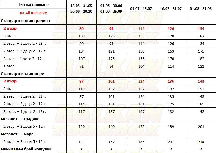 За места в хотела и калкулация на цена ни трябват точни дати от/до, брой нощувки, колко възрастни и деца в стая, навършени години на децата. Ползвайте бутона - Резервирай за да видите всички цени Или се обадете на 02 / 950 22 05, 02 / 980 1004, 0885 596 067