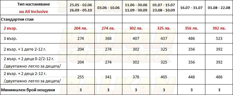 За места в хотела и калкулация на цена ни трябват точни дати от/до, брой нощувки, колко възрастни и деца в стая, навършени години на децата. Ползвайте бутона - Резервирай за да видите всички цени Или се обадете на 02 / 950 22 05, 02 / 980 1004, 0885 596 067