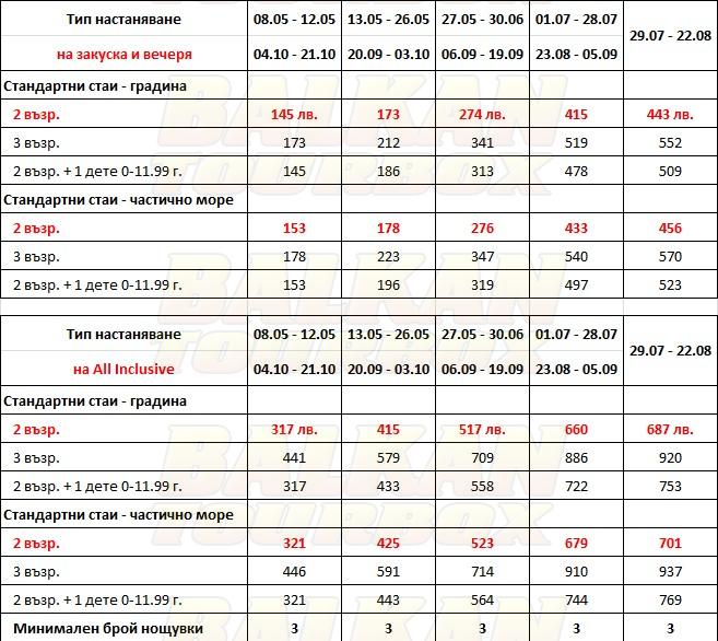 За места в хотела и калкулация на цена ни трябват точни дати от/до, брой нощувки, колко възрастни и деца в стая, навършени години на децата. Ползвайте бутона - Резервирай за да видите всички цени Или се обадете на 02 / 950 22 05, 02 / 980 1004, 0885 596 067