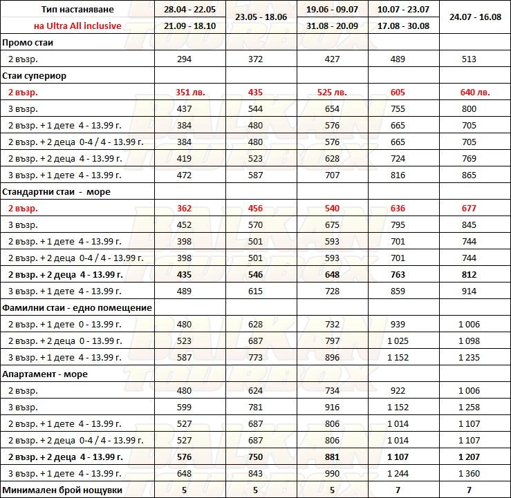 За места в хотела и калкулация на цена ни трябват точни дати от/до, брой нощувки, колко възрастни и деца в стая, навършени години на децата. Ползвайте бутона - Резервирай за да видите всички цени Или се обадете на 02 / 950 22 05, 02 / 980 1004, 0885 596 067