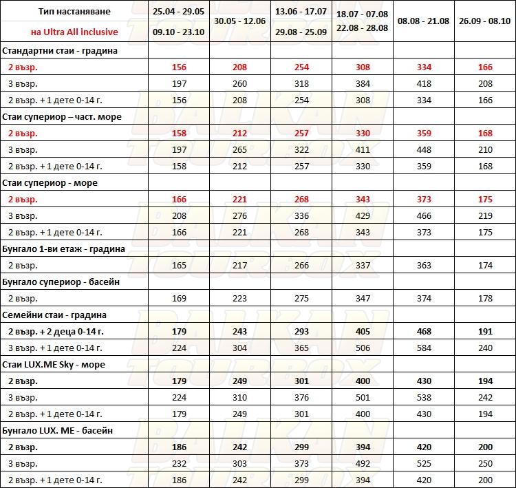 За места в хотела и калкулация на цена ни трябват точни дати от/до, брой нощувки, колко възрастни и деца в стая, навършени години на децата. Ползвайте бутона - Резервирай за да видите всички цени Или се обадете на 02 / 950 22 05, 02 / 980 1004, 0885 596 067