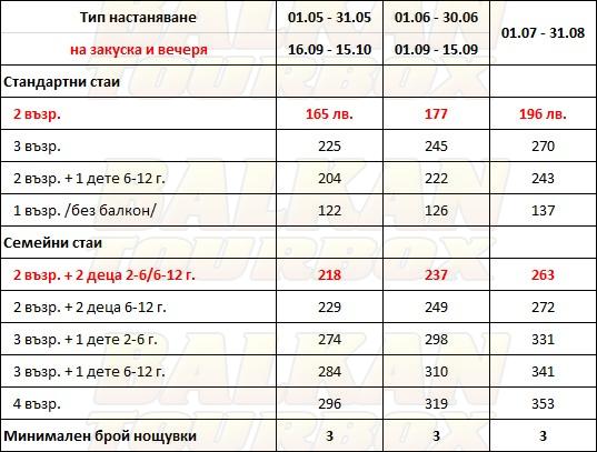 За места в хотела и калкулация на цена ни трябват точни дати от/до, брой нощувки, колко възрастни и деца в стая, навършени години на децата. Ползвайте бутона - Резервирай за да видите всички цени Или се обадете на 02 / 950 22 05, 02 / 980 1004, 0885 596 067