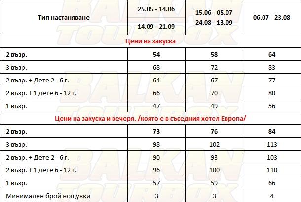 За места в хотела и калкулация на цена ни трябват точни дати от/до, брой нощувки, колко възрастни и деца в стая, навършени години на децата. Ползвайте бутона - Резервирай за да видите всички цени Или се обадете на 02 / 950 22 05, 02 / 980 1004, 0885 596 067