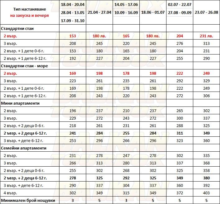 За места в хотела и калкулация на цена ни трябват точни дати от/до, брой нощувки, колко възрастни и деца в стая, навършени години на децата. Ползвайте бутона - Резервирай за да видите всички цени Или се обадете на 02 / 950 22 05, 02 / 980 1004, 0885 596 067