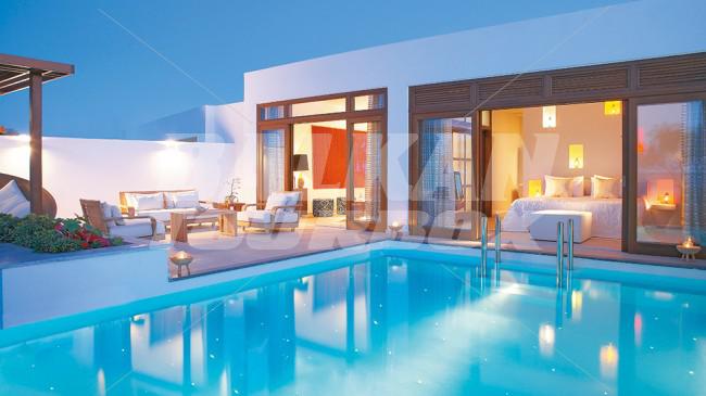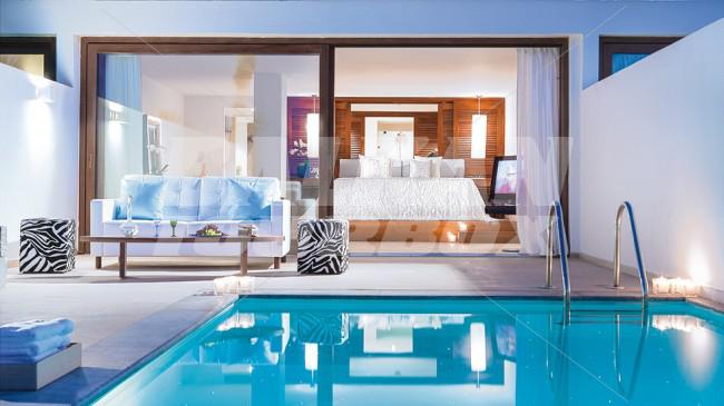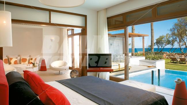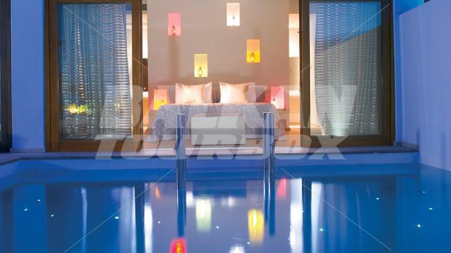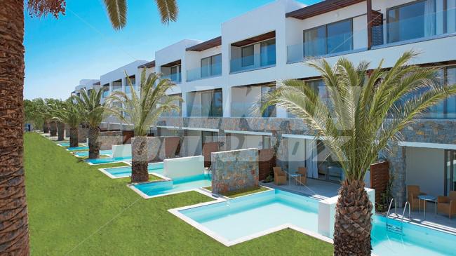 Петзведният хотел Amirandes Grecotel Exclusive Resort е заобиколен от градини и палмови лагуни между каменни тераси. Курортният комплекс предлага 205 луксозно обзаведени самостоятелни помещения за настаняване на гостите, повечето със собствен басейн и тераса. Хотелът Разполага с открит басейн с олимпийски размери с морска вода и закрит басейн, барове и ресторанти. Има спа център с фитнес център, сауна и възможност за различни терапии и лечения. Предлага настаняване на закуска и вечеря на своите гости по време на лятната им почивка.Обслужващи части и други условия