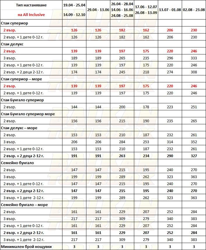 За места в хотела и калкулация на цена ни трябват точни дати от/до, брой нощувки, колко възрастни и деца в стая, навършени години на децата. Ползвайте бутона - Резервирай за да видите всички цени Или се обадете на 02 / 950 22 05, 02 / 980 1004, 0885 596 067