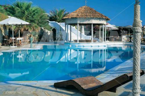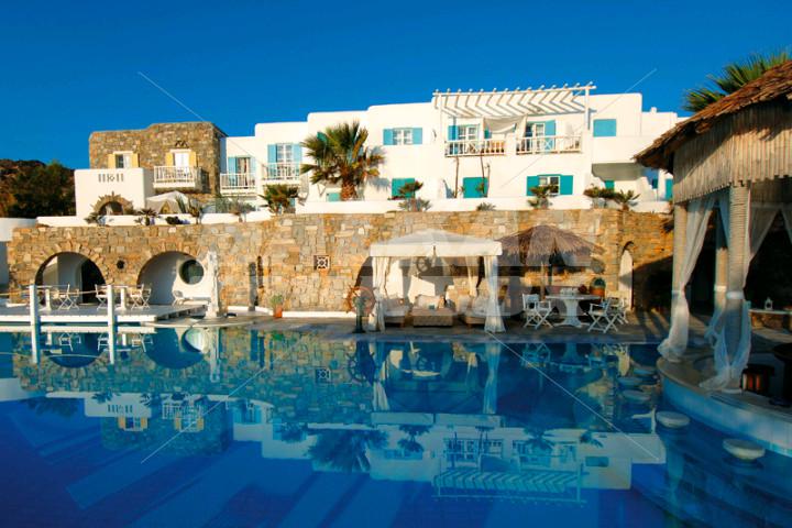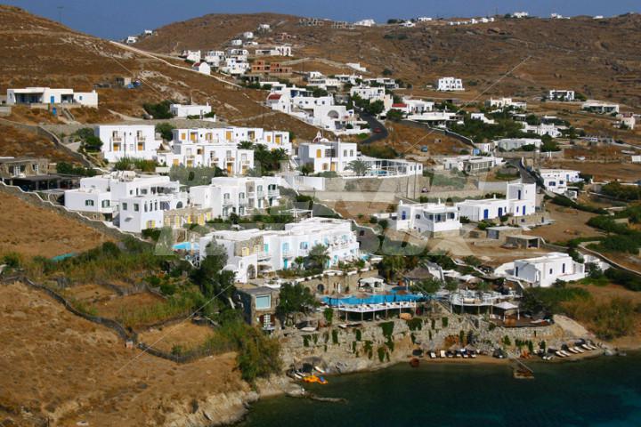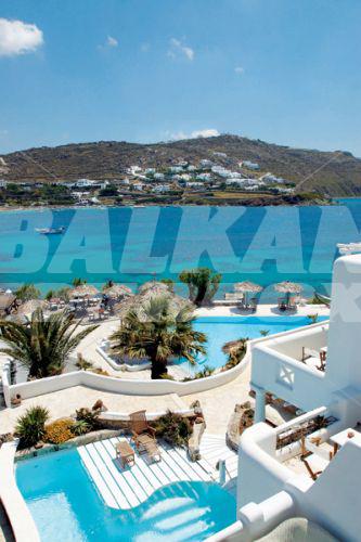 Хотелът е разположен на брега на залива Орнос, на 3 км от град Миконос и летището.Обслужващи части и други условия