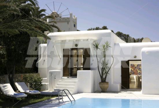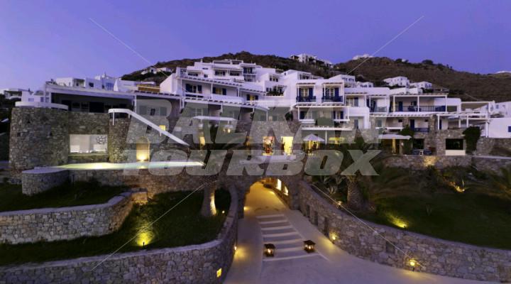 Хотелът е разпорожен непосредствено до плажа, на 4 км от летището, на 3 км от центъра на град Миконос.Обслужващи части и други условия