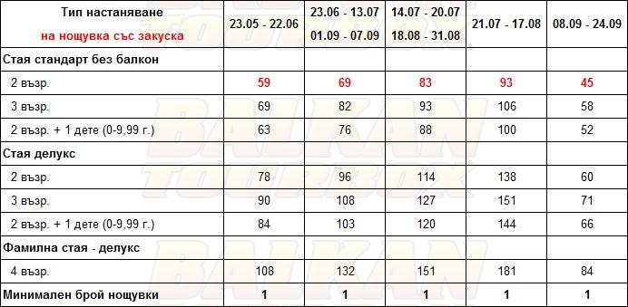 За места в хотела и калкулация на цена ни трябват точни дати от/до, брой нощувки, колко възрастни и деца в стая, навършени години на децата. Ползвайте бутона - Резервирай за да видите всички цени Или се обадете на 02 / 950 22 05, 02 / 980 1004, 0885 596 067
