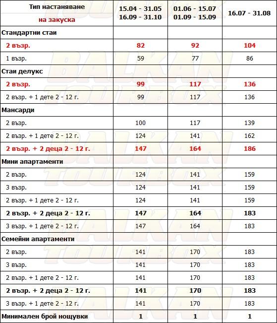 За места в хотела и калкулация на цена ни трябват точни дати от/до, брой нощувки, колко възрастни и деца в стая, навършени години на децата. Ползвайте бутона - Резервирай за да видите всички цени Или се обадете на 02 / 950 22 05, 02 / 980 1004, 0885 596 067