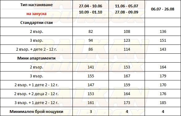 За места в хотела и калкулация на цена ни трябват точни дати от/до, брой нощувки, колко възрастни и деца в стая, навършени години на децата. Ползвайте бутона - Резервирай за да видите всички цени Или се обадете на 02 / 950 22 05, 02 / 980 1004, 0885 596 067