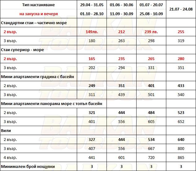 За места в хотела и калкулация на цена ни трябват точни дати от/до, брой нощувки, колко възрастни и деца в стая, навършени години на децата. Ползвайте бутона - Резервирай за да видите всички цени Или се обадете на 02 / 950 22 05, 02 / 980 1004, 0885 596 067