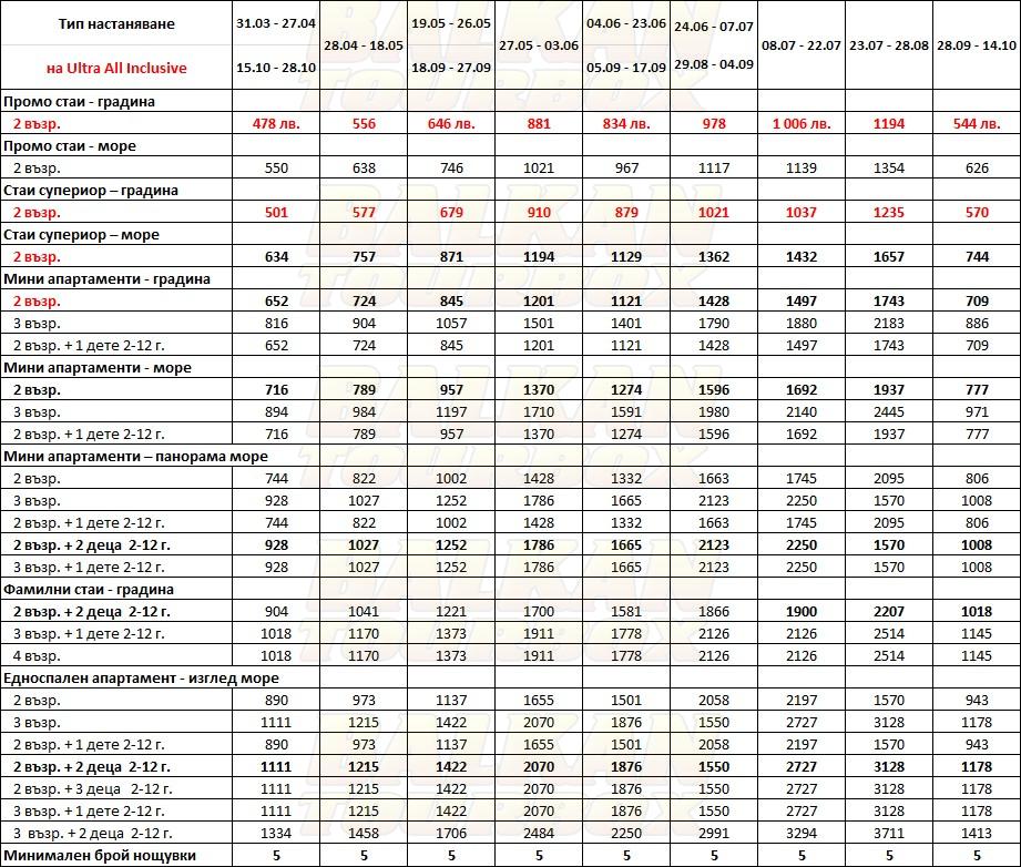 За места в хотела и калкулация на цена ни трябват точни дати от/до, брой нощувки, колко възрастни и деца в стая, навършени години на децата. Ползвайте бутона - Резервирай за да видите всички цени Или се обадете на 02 / 950 22 05, 02 / 980 1004, 0885 596 067