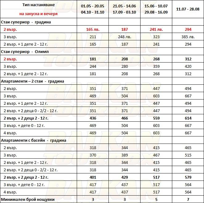 За места в хотела и калкулация на цена ни трябват точни дати от/до, брой нощувки, колко възрастни и деца в стая, навършени години на децата. Ползвайте бутона - Резервирай за да видите всички цени Или се обадете на 02 / 950 22 05, 02 / 980 1004, 0885 596 067