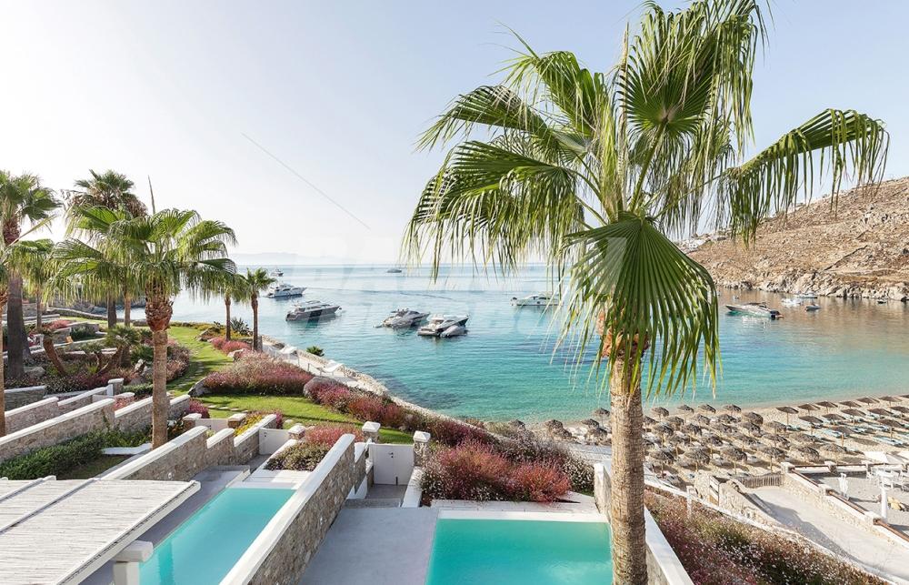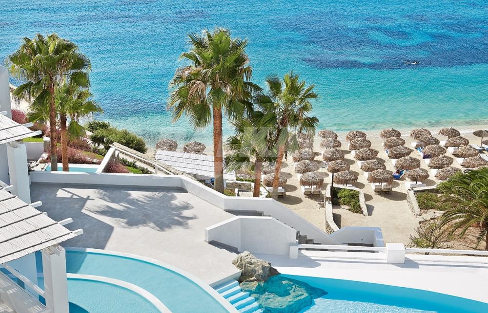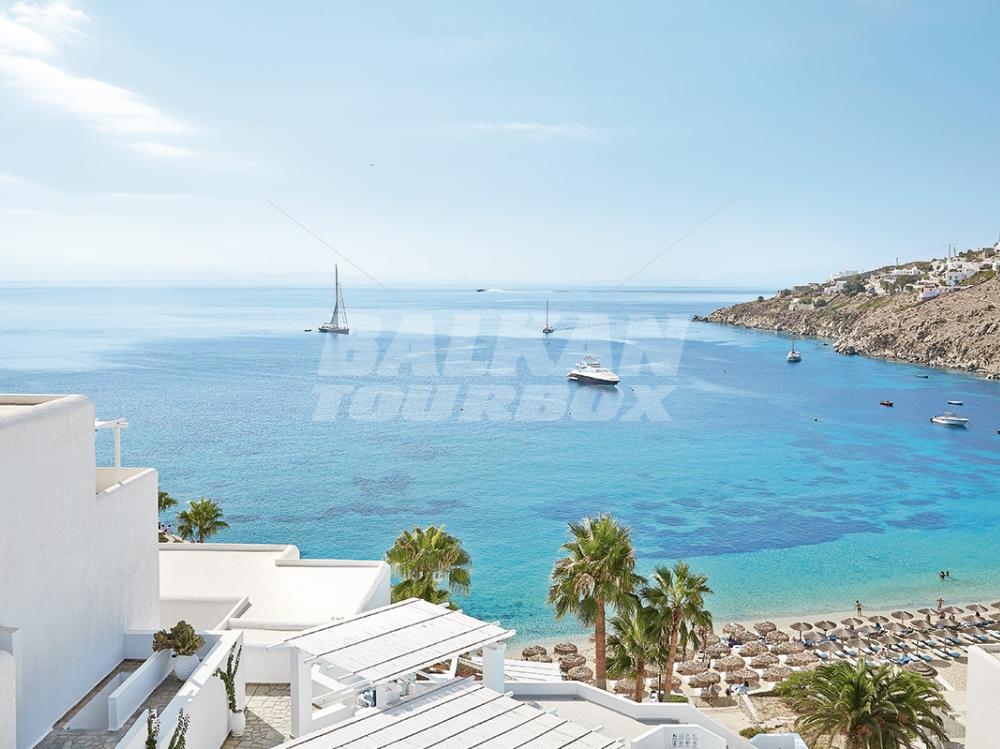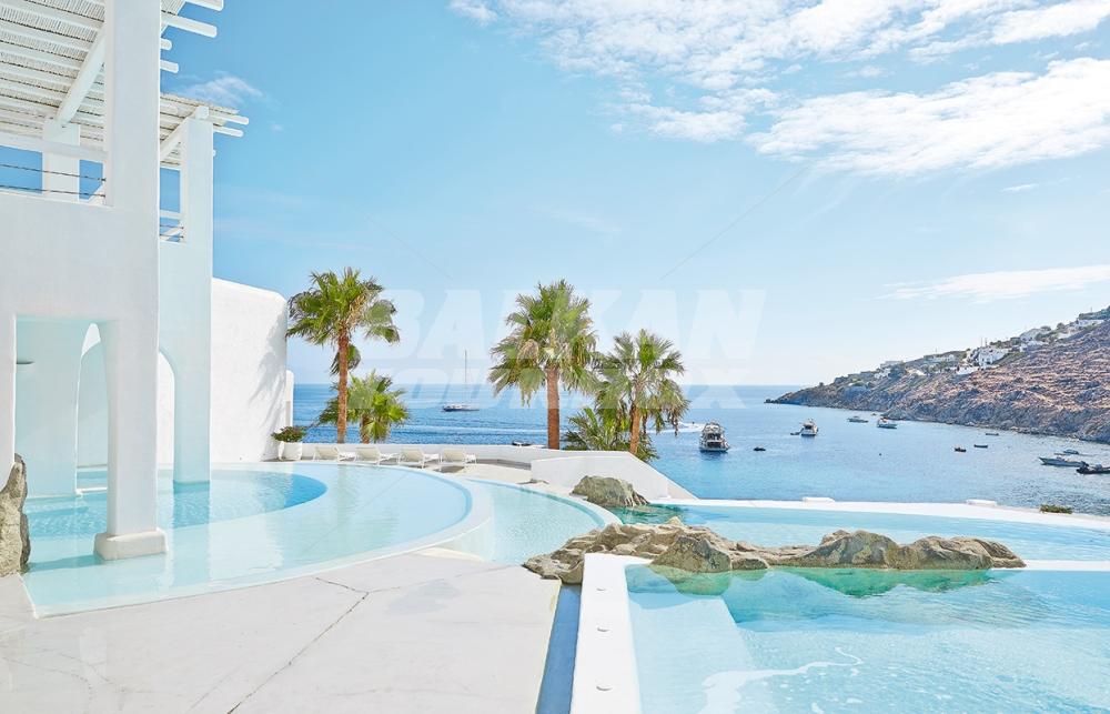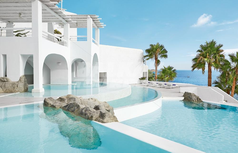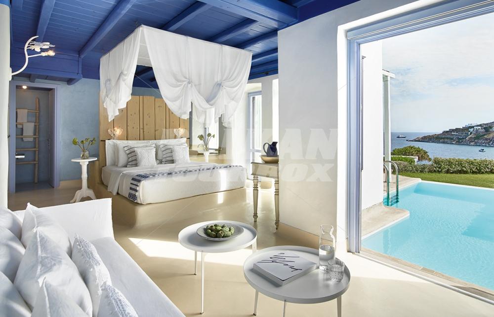 Петзвездният луксозен комплекс от бунгала и вили Mykonos Blu Grecotel Exclusive Resort е първа линия хотел с частна зона на плажа Псару в Миконос, Гърция. Предлага СПА център, инфинити басейн на второ ниво с изглед към морето и изискана обстановка за почивка.
