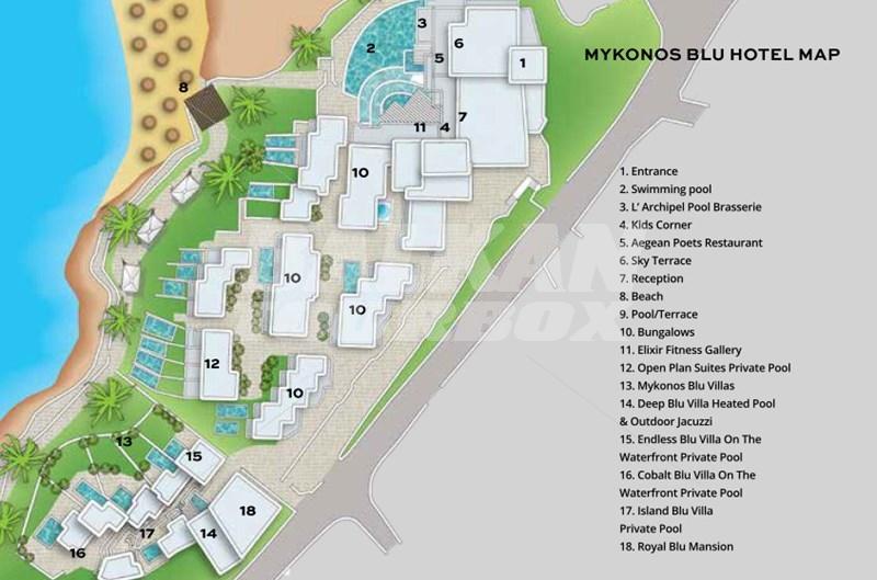 Mykonos Blu разполага с бунгала и вили, оборудвани с вградени вани или душове, някои са с частни басейни с гледка към морето, LCD телевизори и безплатен Wi-Fi. Гостите могат да ползват СПА център с модерна фитнес зала, сауна и салон за красота. Предлагат се а-ла-карт обяд и вечеря със специалитети от морски дарове.Обслужващи части и други условия