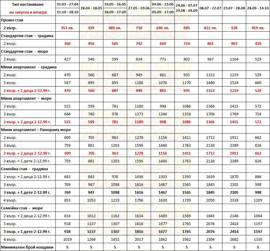 За места в хотела и калкулация на цена ни трябват точни дати от/до, брой нощувки, колко възрастни и деца в стая, навършени години на децата. Ползвайте бутона - Резервирай за да видите всички цени Или се обадете на 02 / 950 22 05, 02 / 980 1004, 0885 596 067