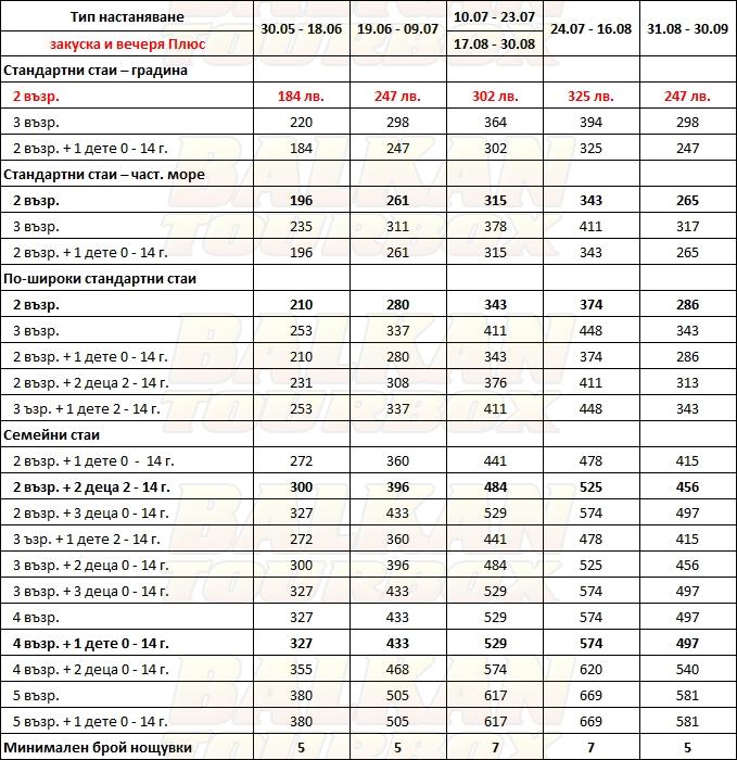 За места в хотела и калкулация на цена ни трябват точни дати от/до, брой нощувки, колко възрастни и деца в стая, навършени години на децата. Ползвайте бутона - Резервирай за да видите всички цени Или се обадете на 02 / 950 22 05, 02 / 980 1004, 0885 596 067