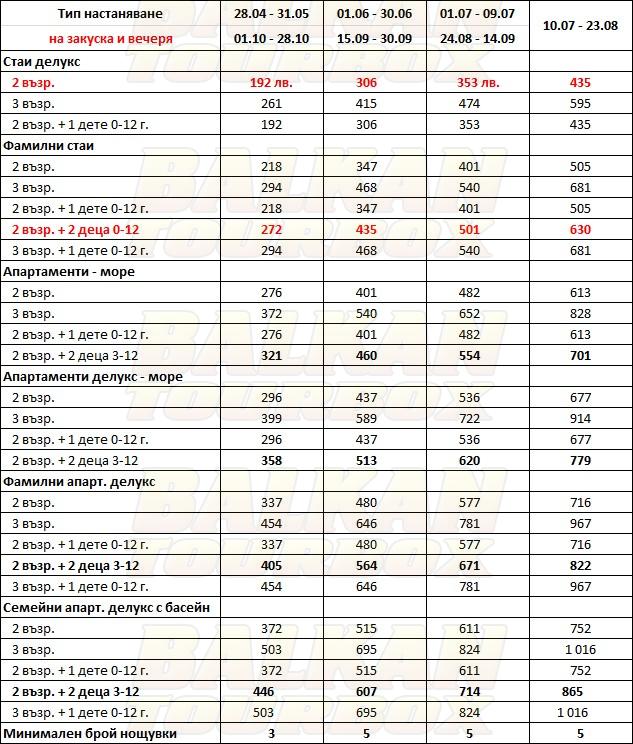 За места в хотела и калкулация на цена ни трябват точни дати от/до, брой нощувки, колко възрастни и деца в стая, навършени години на децата. Ползвайте бутона - Резервирай за да видите всички цени Или се обадете на 02 / 950 22 05, 02 / 980 1004, 0885 596 067