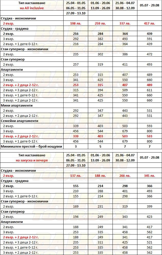 За места в хотела и калкулация на цена ни трябват точни дати от/до, брой нощувки, колко възрастни и деца в стая, навършени години на децата. Ползвайте бутона - Резервирай за да видите всички цени Или се обадете на 02 / 950 22 05, 02 / 980 1004, 0885 596 067
