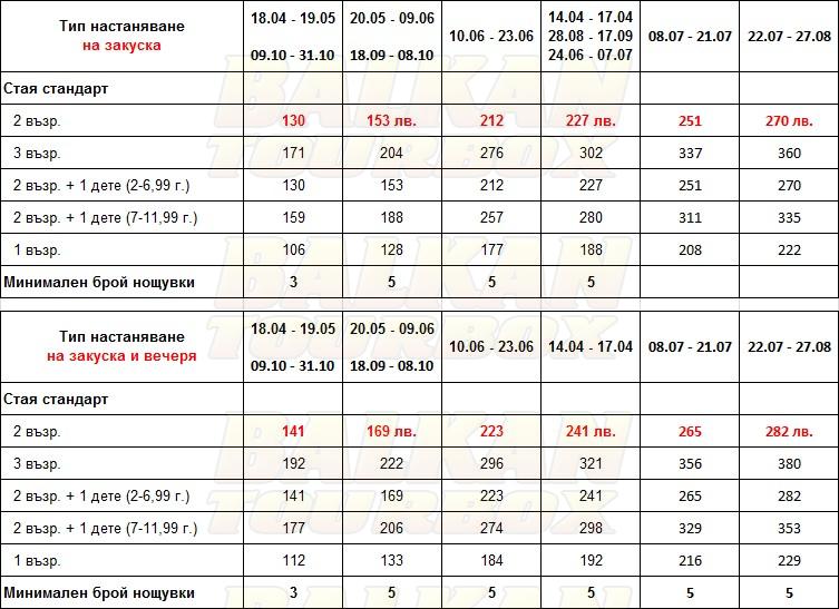 За места в хотела и калкулация на цена ни трябват точни дати от/до, брой нощувки, колко възрастни и деца в стая, навършени години на децата. Ползвайте бутона - Резервирай за да видите всички цени Или се обадете на 02 / 950 22 05, 02 / 980 1004, 0885 596 067