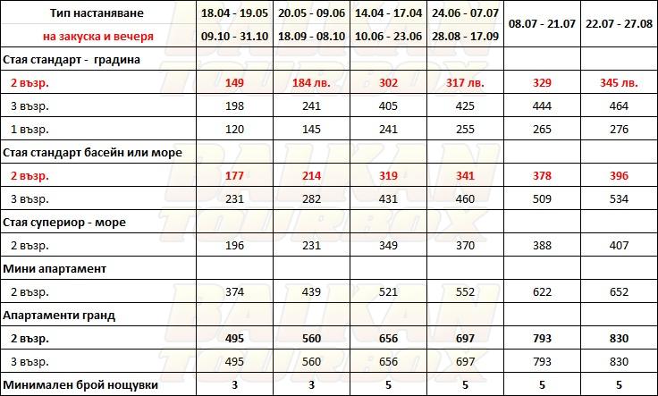 За места в хотела и калкулация на цена ни трябват точни дати от/до, брой нощувки, колко възрастни и деца в стая, навършени години на децата. Ползвайте бутона - Резервирай за да видите всички цени Или се обадете на 02 / 950 22 05, 02 / 980 1004, 0885 596 067