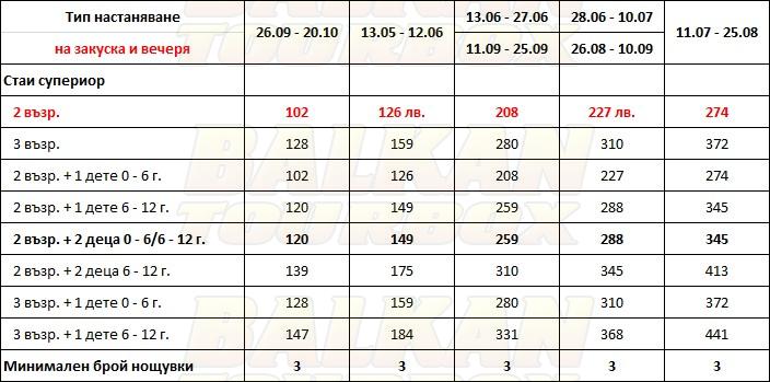 За места в хотела и калкулация на цена ни трябват точни дати от/до, брой нощувки, колко възрастни и деца в стая, навършени години на децата. Ползвайте бутона - Резервирай за да видите всички цени Или се обадете на 02 / 950 22 05, 02 / 980 1004, 0885 596 067