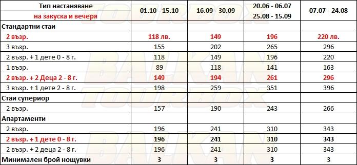 За места в хотела и калкулация на цена ни трябват точни дати от/до, брой нощувки, колко възрастни и деца в стая, навършени години на децата. Ползвайте бутона - Резервирай за да видите всички цени Или се обадете на 02 / 950 22 05, 02 / 980 1004, 0885 596 067