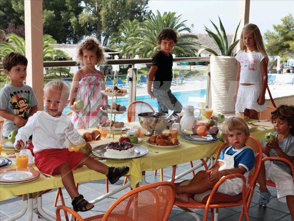 All Inclusive системата включва: Закуска на бюфет, обяд, вечеря в главния ресторант на хотела. Късна закуска. При пристигане в хотела във всяка стая има по 1 бутилка минерална вода и бутилка вино в зависимост от престоя. По време на обяда и вечерята са включени вода, леки напитки и бира. От 10.30 ч. до 24.00 ч. напитки се сервират в бара на хотела: местни и чужди безалкохолни и алкохолни напитки, като ликьори, вино от собствената винарна, бира, минерална вода, сокове, кафе, чай. Коктейлно меню включващо 3 алкохолни и 2 безалкохолни коктейла. В хотела се има тематични вечери на седмица до 2 на седмица. Обикновено това са гръцка и италианска вечери с Show cooking. Анимация по време на вечерята (5 пъти седмично във висок сезон и 3 пъти седмично в останалите периоди). Предлагат се 2 следобедни закуски, включващи чай, кафе, чай, кексчета и сладки, сладолед. Системата може да бъде променяна или модифицирана във всеки един момент по усмотрение на хотела.