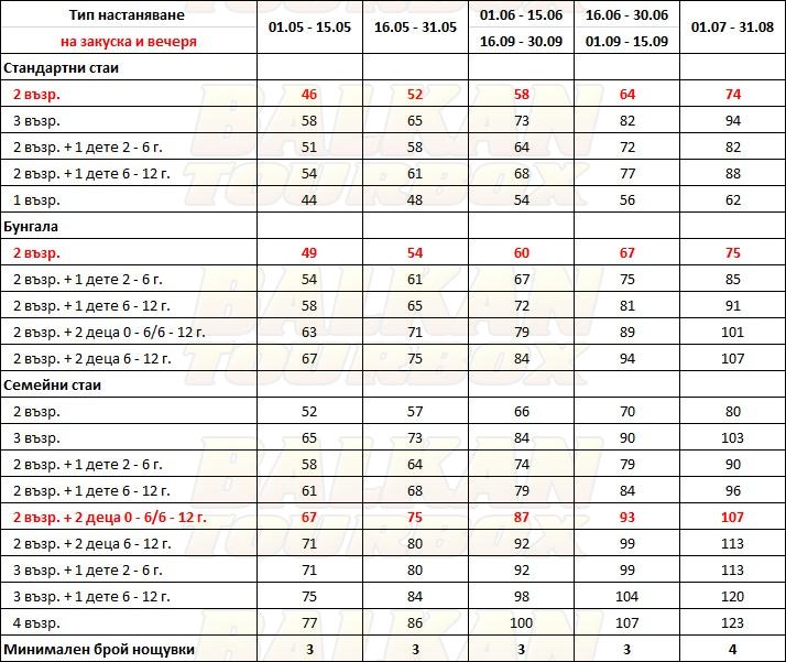 За места в хотела и калкулация на цена ни трябват точни дати от/до, брой нощувки, колко възрастни и деца в стая, навършени години на децата. Ползвайте бутона - Резервирай за да видите всички цени Или се обадете на 02 / 950 22 05, 02 / 980 1004, 0885 596 067