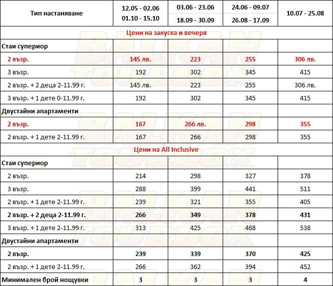 За места в хотела и калкулация на цена ни трябват точни дати от/до, брой нощувки, колко възрастни и деца в стая, навършени години на децата. Ползвайте бутона - Резервирай за да видите всички цени Или се обадете на 02 / 950 22 05, 02 / 980 1004, 0885 596 067