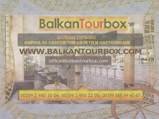 BALKAN TOURBOX Ltd. is a Tourist agency, offering its now numerous clients complete service, in the sphere of tourist and transportation services, as well as the sector’s accompanying insurance, legal, and consulting activities. You could easily reserve place reservations with us for airline tickets, rooms in over 160 thousand hotels the world over, vacation in Greece, vacation in Turkey, vacation in Bulgaria, vacation in Croatia, vacation in Montenegro, trips abroad, cruises, conference events.