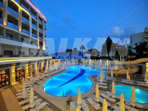 Hotel Golden Rock Beach is located on the seafront in Marmaris - Mugla, Turkey, only 3 km to Marmaris city center and 90 km to the Dalaman airport. This 5-star hotel, opened in 2012, offers accommodation in air-conditioned guest rooms and suites with plasma TV, direct dial telephone, minibar, safe, balcony and a private bathroom with shower. The hotel Golden Rock Beach has restaurants, bars and spa center with an outdoor and indoor pools, children's pool, sauna, a gym and a Turkish bath.The hotel offers all-inclusive packages.Serving parts and other conditions