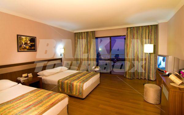 The hotel Lyra Resort is located on the beach, only a 20-minute drive from the Manavgat town centre, Antalia Side, Turkey. The hotel has a main hotel building and 2-storey houses and offers 400 air-conditioned guest rooms withs a TV, minibar and a balcony. The hotel has several restaurant, 5 bars, 2 outdoor pools, an indoor pool, 6 water slides, children's pool, gym and spa center with a Turkish bath and a sauna, tennis and basketball courts.