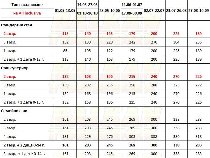 За места в хотела и калкулация на цена ни трябват точни дати от/до, брой нощувки, колко възрастни и деца в стая, навършени години на децата. Ползвайте бутона - Резервирай за да видите всички цени Или се обадете на 02 / 950 22 05, 02 / 980 1004, 0885 596 067