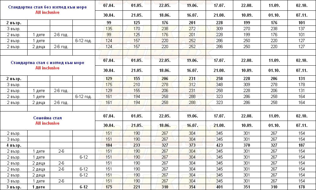 За места в хотела и калкулация на цена ни трябват точни дати от/до, брой нощувки, колко възрастни и деца в стая, навършени години на децата. Ползвайте бутона - Резервирай за да видите всички цени Или се обадете на 02 / 950 22 05, 02 / 980 1004, 0885 596 067