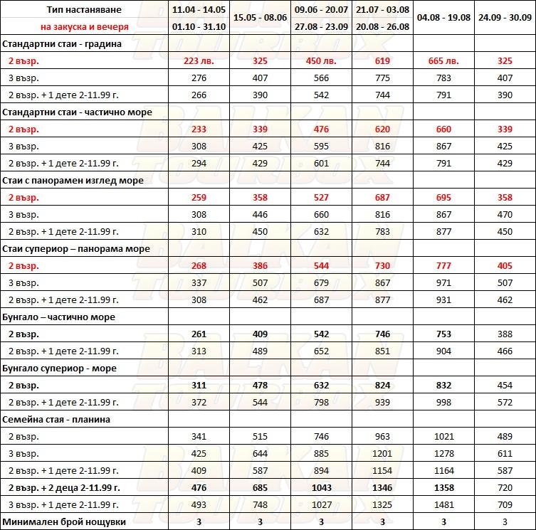 За места в хотела и калкулация на цена ни трябват точни дати от/до, брой нощувки, колко възрастни и деца в стая, навършени години на децата. Ползвайте бутона - Резервирай за да видите всички цени Или се обадете на 02 / 950 22 05, 02 / 980 1004, 0885 596 067
