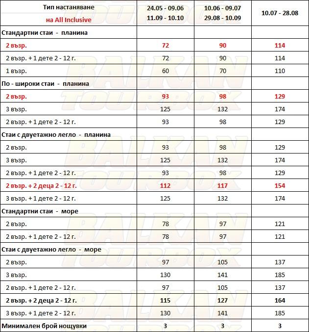 За места в хотела и калкулация на цена ни трябват точни дати от/до, брой нощувки, колко възрастни и деца в стая, навършени години на децата. Ползвайте бутона - Резервирай за да видите всички цени Или се обадете на 02 / 950 22 05, 02 / 980 1004, 0885 596 067