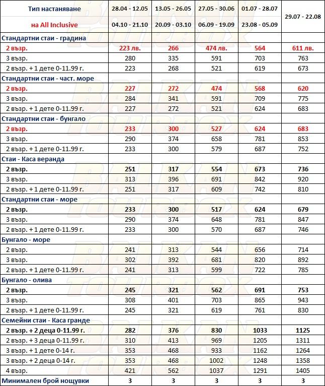 За места в хотела и калкулация на цена ни трябват точни дати от/до, брой нощувки, колко възрастни и деца в стая, навършени години на децата. Ползвайте бутона - Резервирай за да видите всички цени Или се обадете на 02 / 950 22 05, 02 / 980 1004, 0885 596 067