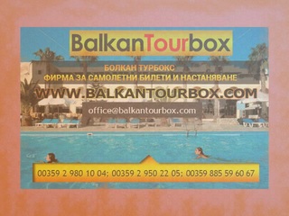 BALKAN TOURBOX Ltd. is a Tourist agency, offering its now numerous clients complete service, in the sphere of tourist and transportation services, as well as the sector’s accompanying insurance, legal, and consulting activities. You could easily reserve place reservations with us for airline tickets, rooms in over 160 thousand hotels the world over, vacation in Greece, vacation in Turkey, vacation in Bulgaria, vacation in Croatia, vacation in Montenegro, trips abroad, cruises, conference events.